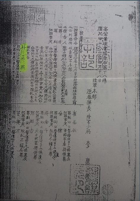 사진 : 군법재판에서 무기징역을 받은 박정희소령에 대한 육군참모총장 이응준소장 결재 서류