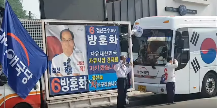 사진 : 조원진대표님의 방훈화후보 유세 지원 중 시민에게 거수경례 모습과 방훈화후보 활동