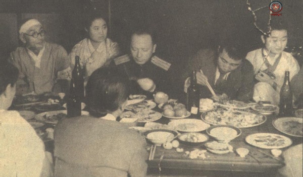 사진 3 : 그 날 저녁 평양 요리(기생)집에서 소련 정치장교 스티코프가 조만식선생에게 처음으로 김성주를 상견례시켜주었고, 김성주가 돼지같이 음식을 쳐먹는 모습.