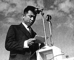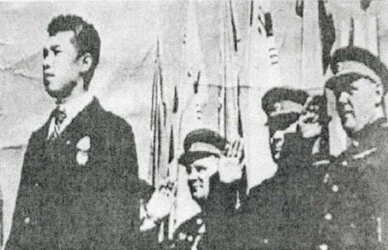 1945년 10월 14일(화) 평양 기림리 운동장에서 소련 스티코프가 처음 대중에게 김성주를 김일성장군으로 등장시키기 직전 소련군 환영식 무대에 선 조만식선생(산정현장로교회)과 박현숙장로(남산현감리교회), 옆에 미하일 강소좌.
