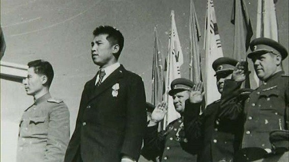 사진 2 : 1945년 10월 13일(월) 고려인 2세 정치장교 미하일강소좌의 양복을 빌려입고,