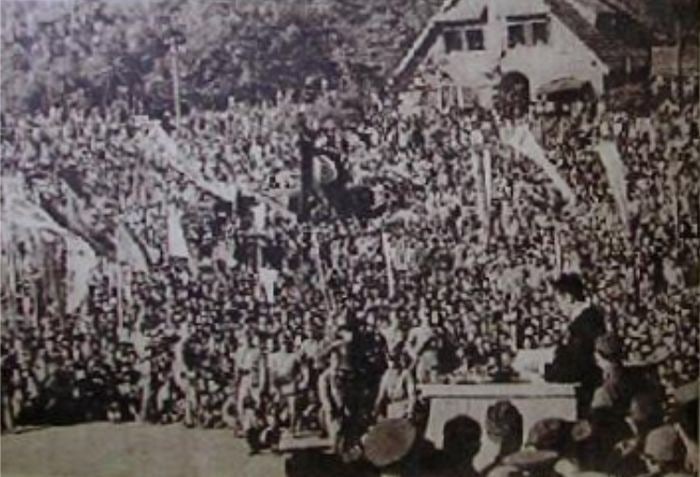 사진 12 : 기림리 운동장에 강제로 동원한 군중, 새파란 김성주가 김일성이라고 등장시키자 모두들 실망하여 귀가하는 것을 총칼로 위협하여 자리를 지킴.