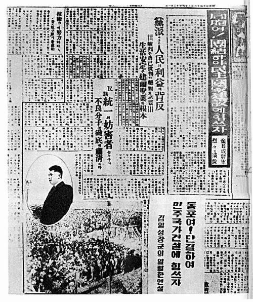 사진 1 : 金聖柱(김성주)가 曺晩植先生(조만식선생)과 만남에서 가짜 金日星(김일성)이라고 실토한 사실을 보도한 당시 신문.
