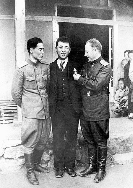 소련군 적기 훈장을 자랑하는 김성주대위와 옆에서 훈장을 만져보는 정치장교 매클레르중좌.